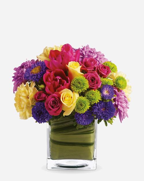 Give someone a truly fine day – send them this gorgeous spring mix of roses, tulips and fresh blossoms in a range of cool hues, nestled in a modern glass cube vase. This enchanting bouquet is sweet, petite and can’t be beat!