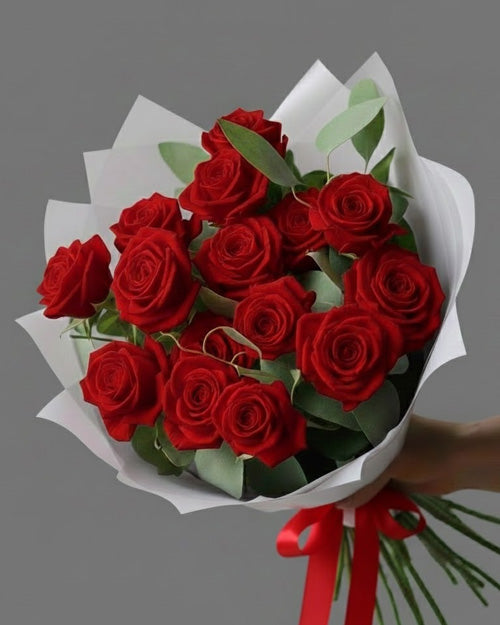Our long lasting premium red roses beautifully gift wrapped with lush greenery. A great way to tell your special someone that you're thinking of him/her today.