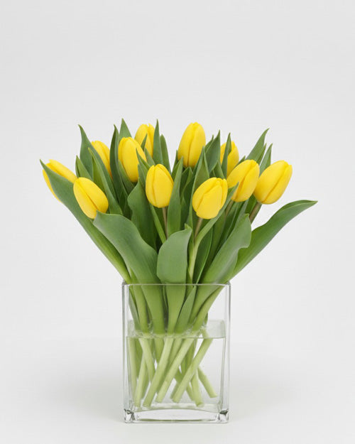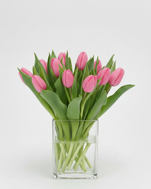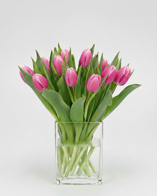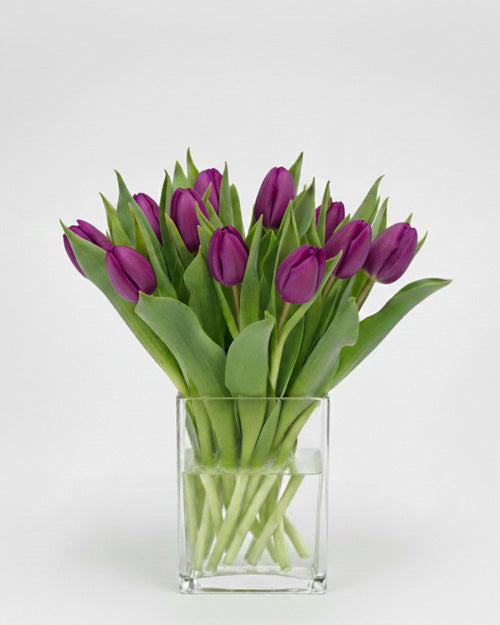 Burst of tulips are presented in a clear vase. Simply fresh display of Spring that’s guarantee to deliver a smile.