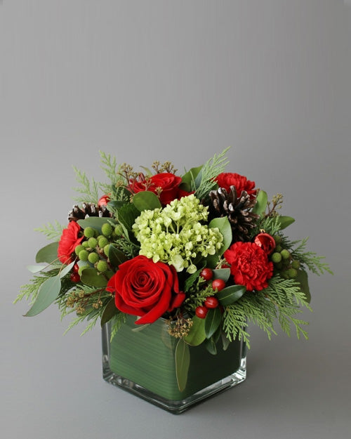 Beautiful seasonal reds & greens including roses, cymbidium orchids, tulips, carnations & berries, all dressed up with pine cones, baubles & winter greens.