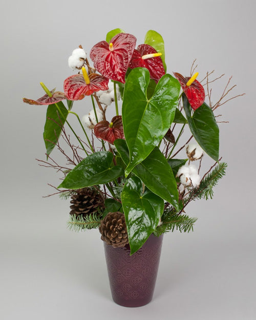 Make a bold and sophisticated statement this season with our Holiday Anthurium planter. Celebrated for their glossy, heart-shaped blooms and extraordinary longevity, anthuriums bring a sculptural, contemporary elegance to holiday decor. This arrangement showcases their stunning beauty in a festive setting, offering a refreshingly modern alternative to traditional Christmas flowers.