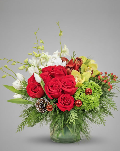 For those who celebrate with sophistication, the Holiday in Style arrangement is your ultimate seasonal accessory. This contemporary masterpiece breaks from tradition with a refined color palette and artistic composition, proving that holiday decor can be both festive and fashion-forward.