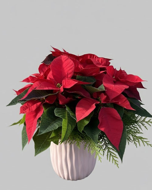 No holiday is complete without the iconic beauty of a red poinsettia. Our classic Red Poinsettia plant features lush, velvety crimson bracts and rich green foliage, carefully selected for its fullness and vibrant color. As the undisputed symbol of Christmas cheer, it brings a timeless, warm welcome to any home or office.
