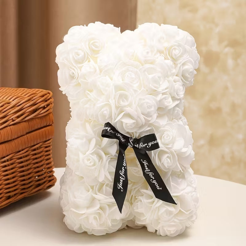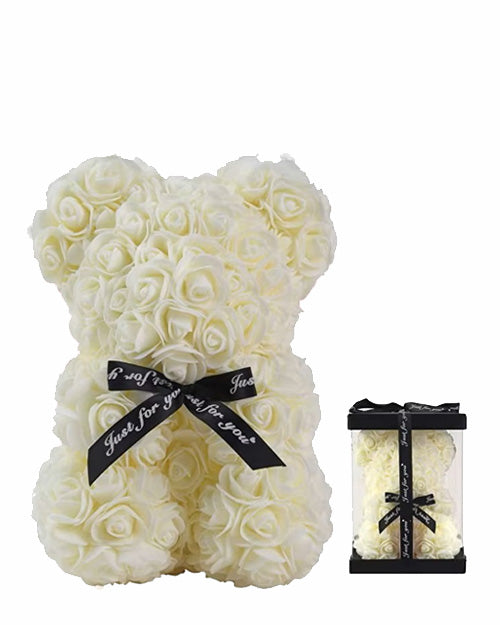 Luxe White foam rose bear presented in an elegant gift box. A perfect choice for anniversaries, birthdays, or Valentine’s Day.