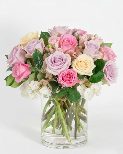 The Morning Meadow arrangement brings the delicate beauty of a morning garden into your space. Featuring lush pink lilies and roses, this arrangement is artfully composed in a garden glass vase to create a romantic and soothing floral display. It’s perfect for birthdays, anniversaries, or simply to brighten someone’s day.